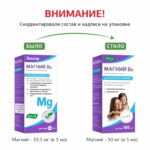 Магний с витамином В6 в легкоусвояемой жидкой форме от компании Эвалар: • способствует улучшению состояния нервной системы, мышц и сердца; • повышает устойчивость организма к стрессу; • поддерживает здоровый сон; • способствует снятию мышечных спазмов и судорог.
