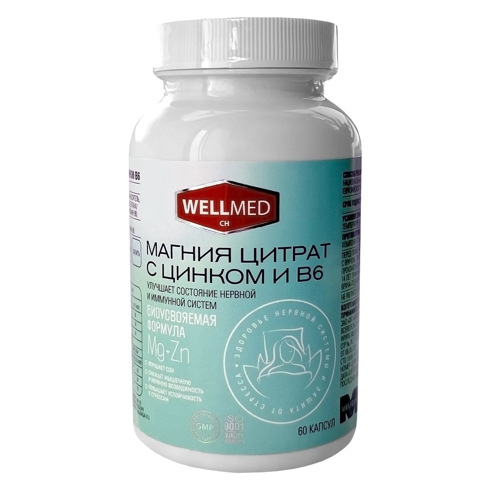 магния цитрат, магния оксид, капсула (желатин / носитель гидроксипропилметилцеллюлоза, без красителей или с красителем титана диоксид), цинка цитрат, пиридоксина гидрохлорид (витамин В6).