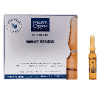 Бренд MARTIDERM - один из ведущих Испанских брендов. Миссия MartiDerm - обеспечение потребителей высококачественным косметическим продуктом и решения с инновационными, эффективными формулами для ухода и благополучия кожи.Линия Platinum - линейка средств для восстановления и обновления кожиMARTIDERM PLATINUM АМПУЛЫ НОЧНОЕ ВОССТАНОВЛЕНИЕ - для всех типов кожи.Внешний вид и свойства: лёгкая сыворотка прозрачного цвета, с легкой отдушкой унисекс.Возраст: с 30 летРегенерирующая сыворотка-уход содержит бустер-компоненты, усиливающие действие активных веществ.Обладает накопительным эффектом действия альфа-гидроксикислот в сочетании с коллагеном и гиалуроновой кислотой, что делает кожу более гладкойАмпульное лечение MartiDerm Platinum Night Renew - это процедура интенсивного восстановления кожи во время ночного отдыха.Под действием активных компонентов укрепляется клеточная структура, а также защитный барьер, препятствующий потере влаги, увяданию и разрушительному влиянию внешних факторов.Активные компоненты:-АНА-кислоты отшелушивают ороговевшие частички эпидермиса, выравнивают тон и рельеф кожи, устраняют очаги воспаления;-морской коллаген сокращает глубину морщин, разглаживает, смягчает;-гиалуроновая кислота придает коже упругость, глубоко увлажняет и удерживает влагу в клетках.Дерматологически протестированоРезультат: Сияющая, молодая, упругая кожа. Однородный тон.Согласно клиническому исследованию, проводившемуся с участием 22 мужчин и женщин, после 28 дней использования ампул участники отметили:на 62% обновился верхний слой эпидермиса;на 95% кожа стала более упругой;на 91% сократились признаки старения;на 95% выровнялся тон кожи.