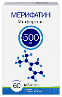 • каждые 3 месяца, если у Вас клиренс креатинина 30-44 мл/мин. В случае клиренса креатинина менее 30 мл/мин применение препарата противопоказано. Если Вы человек пожилого возраста, то Вам следует проявлять особую осторожность при возможном нарушении функции почек, при дегидратации (хроническая или тяжелая диарея, многократные приступы рвоты), при одновременном применении гипотензивных лекарственных средств, диуретиков или нестероидных противовоспалительных препаратов. Хирургические операции Если Вам предстоит хирургическая операция под общей, спинальной или эпидуральной анестезией, то применение Мерифатина должно быть прекращено во время проведения такой операции. Прием препарата Мерифатин можно продолжить не ранее чем через 48 ч после хирургической операции или возобновления приема пищи при условии, что функция почек была обследована и признана нормальной. Сердечная недостаточность Если у Вас имеется сердечная недостаточность, то риск развития гипоксии и почечной недостаточности у Вас более высокий. В случае подтверждения у Вас хронической сердечной недостаточности врач должен регулярно проводить мониторинг сердечной функции и функции почек во время приема Мерифатина. Прием Мерифатина при острой сердечной недостаточности с нестабильными показателями гемодинамики противопоказан. Применение йодсодержащих рентгеноконтрастных средств Внутрисосудистое введение йодсодержащих рентгеноконтрастных средств может привести к развитию почечной недостаточности и кумуляции метформина, что повышает риск развития лактоацидоза. Метформин необходимо отменить, в зависимости от функции почек, за 48 ч до и во время рентгенологического исследования с применением йодсодержащих рентгеноконтрастных средств. И не возобновлять прием ранее 48 ч после него, при условии, что в ходе обследования функция почек была признана нормальной. Другие методы предосторожности: • Вам рекомендуется ежегодно контролировать уровень витамина В12 в крови. Риск снижения уровня витамина В12 возрастает по мере увеличения дозы метформина, продолжительности терапии и/или у пациентов с наличием факторов риска, вызывающих дефицит витамина В12 • Вам рекомендуется продолжить соблюдать диету с равномерным потреблением углеводов в течение дня. Пациентам с избыточной массой тела рекомендуется продолжать соблюдать гипокалорийную диету (но не менее 1000 ккал/сут). • Вам рекомендуется регулярно проводить стандартные лабораторные анализы для контроля сахарного диабета. Метформин при монотерапии не вызывает гипогликемию, однако рекомендуется проявлять осторожность при его применении в комбинации с инсулином или другими гипогликемическими средствами (например, производными сульфонилмочевины, репаглинидом и др.).Применение метформина рекомендовано для профилактики сахарного диабета 2 типа лицам с предиабетом и дополнительными факторами риска развития явного сахарного диабета 2 типа, такими как: