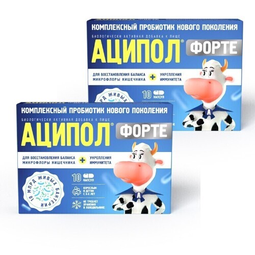 в качестве биологически активной добавки к пище - дополнительного источника пробиотических микроорганизмов (лактобактерии и бифидобактерии) и цинка, которые комплексно способствуют восстановлению баланса микрофлоры кишечника и укреплению иммунитета. Компоненты БАД «Аципол® Форте» способствуют снижению рисков развития нарушений баланса микрофлоры кишечника, которые могут встречаться при различных состояниях, таких как: