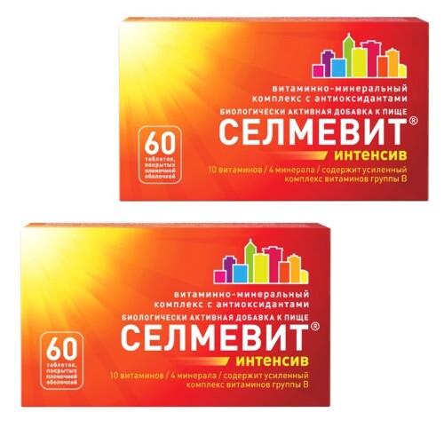 СЕЛМЕВИТ ИНТЕНСИВ - Биологически активная добавка (БАД) к пище - Комплекс витаминов, минералов и биологически активных веществ, являющихся важными факторами метаболических процессов, поддержки нормального функционирования всех органов и систем организма, усиления адаптационных возможностей организма и повышения общей (неспецифической) сопротивляемости организма.