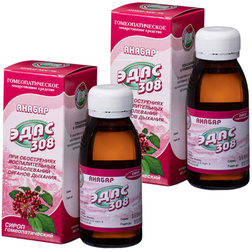 Эдас-308 Анабар, сироп гомеопатический - это гомеопатический лекарственный препарат, применяемый в комплексной терапии обострений хронических воспалительных заболеваний органов дыхания. Многокомпонентный гомеопатический препарат, действие которого обусловлено входящими в его состав компонентами. Применять с осторожностью: сахарный диабет, заболевания печени, алкоголизм, черепно-мозговая травма, эпилепсия, заболевания головного мозга. Перед употреблением взбалтывать. Если не назначено иначе, принимать внутрь вне приема пищи по 1 десертной ложке 3 раза в сутки в течение 2-х недель. Затем по 1 десертной ложке 2 раза в день еще две недели. Перед применением рекомендуется проконсультироваться с врачом.