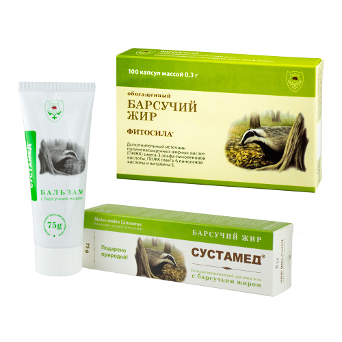 Набор ФИТОСИЛА БАРСУЧИЙ ЖИР ОБОГАЩЕННЫЙ N100 + СУСТАМЕД БАЛЬЗАМ КОСМЕТИЧ Д/КОЖИ ТЕЛА С БАРСУЧЬИМ ЖИРОМ 75,0