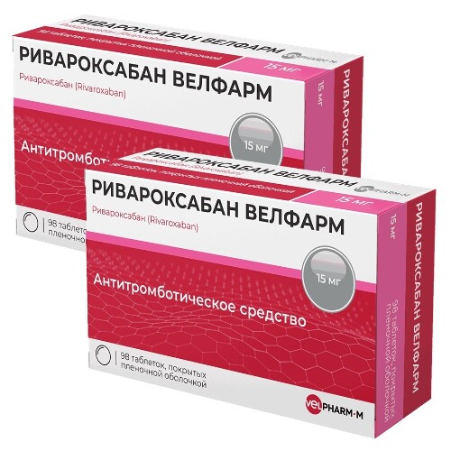 Дети и подростки Препарат РИВАРОКСАБАН ВЕЛФАРМ разрешен для приема у детей и подростков до 18 лет в соответствии с показаниями к применению. Не давайте препарат в дозировке 15 мг детям в возрасте от 0 до 18 лет с массой тела менее 30 кг для лечения и профилактики рецидивов венозной тромбоэмболии. Не давайте препарат в дозировке 20 мг детям в возрасте от 0 до 18 лет с массой тела менее 50 кг для лечения и профилактики рецидивов венозной тромбоэмболии. Не давайте препарат детям в возрасте от 0 до 18 лет по показаниям для взрослых, поскольку безопасность и эффективность применения лекарственного препарата РИВАРОКСАБАН ВЕЛФАРМ у детей и подростков по этим показаниям не установлены. Данные отсутствуют.