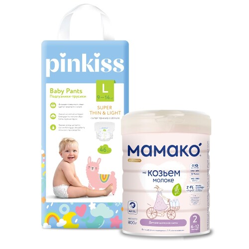 Набор МАМАКО-2 PREMIUM СМЕСЬ СУХАЯ НА КОЗЬЕМ МОЛОКЕ С ОЛИГОСАХАРИДАМИ ГРУДНОГО МОЛОКА 800г + PINKISS ПОДГУЗНИКИ-ТРУСИКИ L/9-14 к