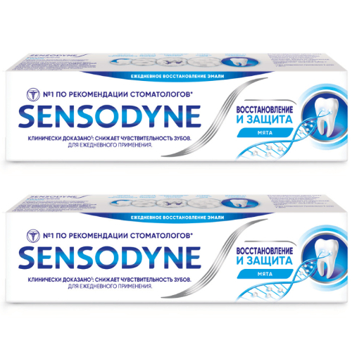 Sensodyne Сенсодин Восстановление и Защита, зубная паста для чувствительных зубов Зубная паста Sensodyne Восстановление и Защита восстанавливает чувствительные участки зубов и обеспечивает продолжительную защиту от повышенной чувствительности**. Благодаря технологии Novamin и фториду натрия на поверхности чувствительных участков зубов образуется слой, похожий по своей структуре на эмаль зубов, который защищает от болезненных ощущений. Sensodyne Восстановление и Защита обеспечивает эффективное продолжительное снижение частоты проявлений чувствительности зубов* и дарит ежедневную защиту от кариеса.