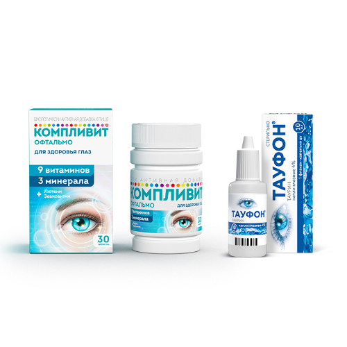 Набор витамины для глаз Компливит Офтальмо №30 + Тауфон (таурин) глазные капли №1 - со скидкой