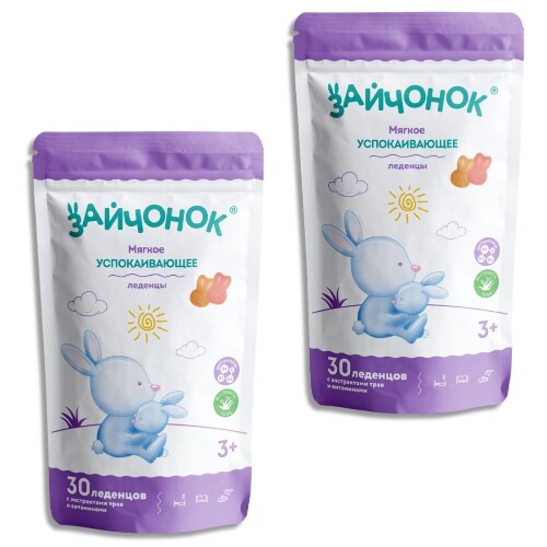 Биологически активная добавка к пище «Леденцы «Зайчонок®» для детей с 3-х лет товарного знака «Здравландия®» в форме вкусных леденцов-зайчиков. Ассорти желтого и красного цвета со вкусом вишни или пломбира. Компоненты комплекса «Леденцы «Зайчонок®» для детей с 3-х лет товарного знака «Здравландия®» оказывают мягкое успокаивающее действие. Продукт с натуральными растительными экстрактами и витаминами со вкусом вишни или пломбира. Компоненты комплекса: витамины В4, В6, С, D3, а также глицин, экстракты ромашки, фенхеля, мяты, душицы и чабреца благотворно влияют на нервную систему, оказывают мягкое успокаивающее действие.