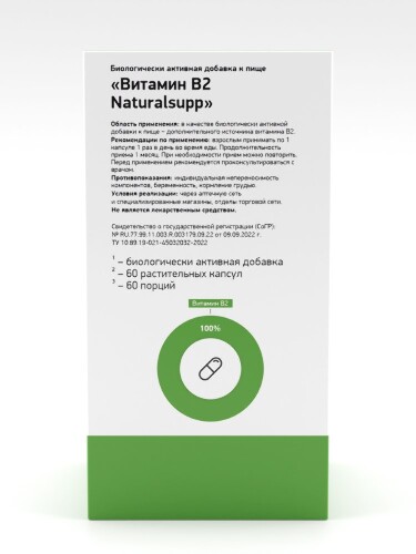 NATURALSUPP ВИТАМИН В2 содержит Рибофлавин (Витамин B2) - водорастворимое органическое соединение, он не накапливается в живых тканях организма человека и за короткий промежуток времени выводится из организма естественным путем через почки.