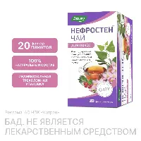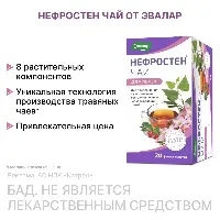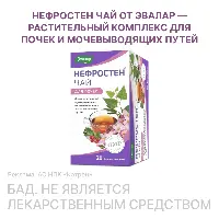 Чай НЕФРОСТЕН сочетает в себе травы, обладающие многогранным комплексным действием для поддержания здоровья почек и мочевыводящих путей 2 фильтр-пакета в день обеспечивают не менее** 5,0 мг флавоноидов в пересчете на рутин и не менее** 16,0 мг арбутина, что составляет 17% и 200 %*** от адекватного уровня потребления, соответственно. Как работают ингредиенты? Трава золототысячника оказывают противовоспалительное, антисептическое, обезболивающее и мочегонное действие без нарушения ионного баланса (калийсберегающий эффект) Листья розмарина обладают спазмолитическим, антиоксидантным, противомикробным, противовоспалительным действием. Корни любистока оказывают мочегонное, спазмолитическое, болеутоляющее, противовоспалительное, антибактериальное действие; поддерживают нормальное кровоснабжение почечного эпителия. Трава горца птичьего обладает мочегонным действием, способствует отхождению конкрементов при камнях в почках и мочевом пузыре, препятствует образованию мочевых камней2. Листья толокнянки - растение оказывает дезинфицирующее, противовоспалительное и диуретическое действие, вследствие чего мочевыводящие пути очищаются от бактериальной флоры и продуктов воспаления. Листья березы обладают антисептическими, противогрибковыми свойствами, применяют их в виде настоев, отваров и настоек как мочегонное и потогонное средство. Плодоножки вишни обладают мочегонным, противовоспалительным действием, способствуют выведению песка из мочеточников. Листья мяты оказывают спазмолитическое действие, снижая тонус гладкой мускулатуры мочевыводящих путей. Чем еще замечателен Чай НЕФРОСТЕН для почек? • 100% натуральный состав. Большинство трав в его составе собираются на Алтае или выращиваются на собственных плантациях Эвалар в экологически чистых предгорьях Алтая без использования химикатов и пестицидов; • Высокая микробиологическая чистота чая обеспечивается мягким способом обработки - «мгновенный пар» - на современной французской установке; • Для наилучшего сохранения целебных свойств, тонкого вкуса и аромата чая НЕФРОСТЕН каждый фильтр-пакет индивидуально упакован в многослойный защитный конверт. Показания: для поддержания функционального состояния почек и мочевыводящих путей