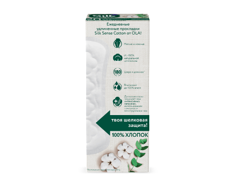 Ola! Silk Sense 100% хлопок - это мягкие и нежные прокладки увеличенного размера со 100% хлопковой поверхностью.