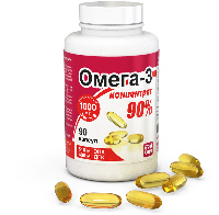Омега-3 концентрат 90% капсулы по. 1500 мг Сырьё получено из рыб с коротким жизненным циклом (анчоусы) и производится с применением современных высокотехнологичных методов очистки, включающих 3 стадии молекулярной дистилляции и карбоновую фильтрацию. Для предотвращения процесса окисления жирных кислот в концентрат добавлена смесь токоферолов (натуральный витамин Е). Содержание компонентов БАД в рекомендуемой суточной норме потребления Компонент БАД / Содержание в рекомендуемой суточной норме потребления, мг, не менее /Удовлетворение адекватного уровня потребления организма* %: ПНЖК Омега-3 / 1000 мг / 50% Эйкозапентаеновая кислота 510 мг / 85% Докозагексаеновая кислота 400 мг / 57,1% Примечание: