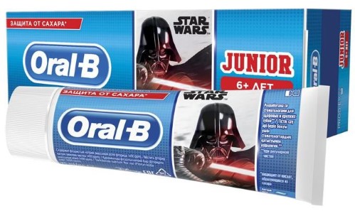 ORAL-B ЗУБНАЯ ПАСТА JUNIOR ДЛЯ ДЕТЕЙ НЕЖНАЯ МЯТА - с изображением персонажей мультфильма «Звездные войны» разработана совместно со стоматологами и помогает детям перейти к самостоятельному уходу за полостью рта.