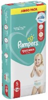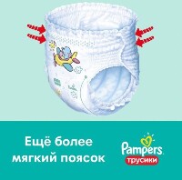 Бренд: PAMPERS PAMPERS Подгузники-трусики Pants Junior от 12 до 17 кг (размер 5). Универсальные: для мальчиков, для девочек Вы заботитесь о нежной коже малыша и хотите, чтобы в трусиках малышу было по-настоящему комфортно? Попробуйте новые трусики Pampers Pants с анатомической посадкой! Супермягкий эластичный поясок нежно прилегает к животику, мягкие бортики вокруг ножек помогают защитить нежную кожу малыша от натираний, а технология мгновенного впитывания удерживает влагу внутри, обеспечивая сухость до 12 часов - как днём, так ночью. Трусики Pampers легко надевать и снимать, так что активные малыши смогут продолжать изучать мир вокруг, не отвлекаясь на смену трусиков! А когда трусики понадобится поменять, просто разорвите их по боковому шву! Преимущества:
