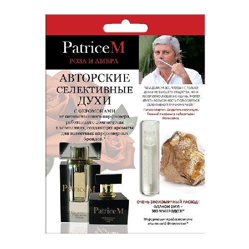"PatriceМ" - это авторская линейка селективных духов, созданная потомственным французским парфюмером Патрисом Мартеном ( Patrice Martine ), который уже более 30 лет работает в компаниях, создающих ароматы для известных парфюмерных брендов. У духов "PatriceМ", очень экономичный расход: флакон 2мл = 300 микро доз! ПИРАМИДА ЗАПАХОВ ( основные , доминирующие ароматы ) Верхние ноты (раскрытие 5-10 минут) РОЗА Ноты сердца (раскрытие 10-20 минут) ЖАСМИН Базовые ноты ( полное раскрытие до 2 часов) БЕЛЫЙ МУСКУС, СЕРАЯ АМБРА ОПИСАНИЕ АРОМАТА «Натуральные изысканные компоненты обеспечивают стойкий аромат. Потомственный парфюмер Патрис Мартен создает невероятно запоминающиеся эфирные композиции. Они раскрываются по-своему на каждой и оставляют неповторимый шлейф. Цветочные древесно-мускусные нотки дарят ощущение гармонии. В начале, Вы почувствуете нежные оттенки специальной парфюмерной розы - центифолии, выращенной на склонах Альп Лазурного Берега Франции. Далее, Вы услышите как, мускус, амбра и жасмин манят и зовут за собой. А наличие в духах феромонов, придадут Вам уверенности и привлекательности!» Духи "PatriceМ", относятся к категории селективной (нишевой) парфюмерии. Селективные духи на каждом человеке раскрываются по разному, даже в течение дня. Это Ваш личный аромат духов! Селективная парфюмерия всегда отличается повышенной стойкостью запаха и выпускается ограниченным тиражом. Парфюмерная композиция «РОЗА и АМБРА» - содержит 187 компонентов, в том числе «FIX MUSK 41296» и молекула «Iso E Super». Духи "PatriceМ" - гипоаллергенные , тк они производятся на масляной основе.