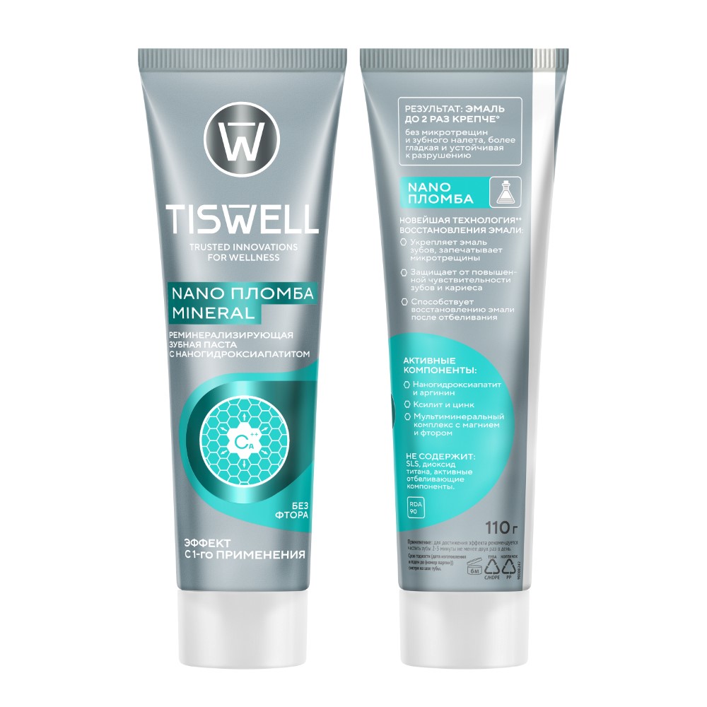 Trusted innovations for wellness - Надежные велнес-инновации.** NANO ПЛОМБА MINERAL - Фантазийное название технологии, в состав которой входит наногидроксиапатит. NANO - НАНО. MINERAL - МИНЕРАЛ. **в линейке зубных паст Tiswell,