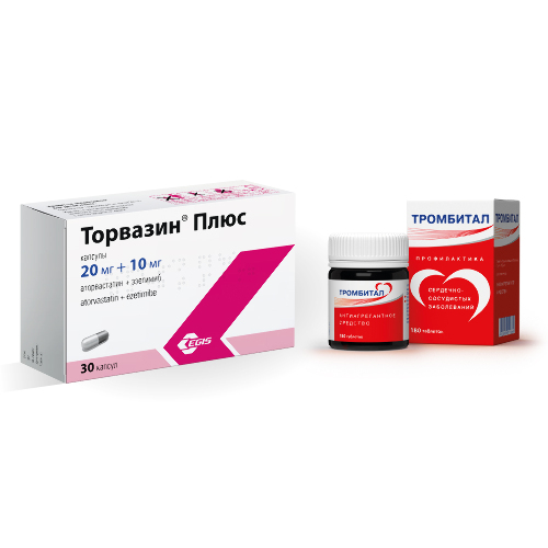 ХС поступает в плазму крови в результате всасывания в кишечнике и эндогенного синтеза. Препарат Торвазин Плюс содержит эзетимиб и аторвастатин, два гиполипидемических компонента, дополняющих друг друга по механизму действия. Комбинация аторвастатин + эзетимиб снижает повышенную концентрацию общего холестерина (ОХС) в плазме крови, ХС ЛПНП, аполипопротеина B (АпоВ), триглицеридов (ТГ) и холестерина липопротеинов невысокой плотности (ХС-не-ЛПВП, рассчитывается как разность между концентрацией ОХС и концентрацией холестерина липопротеинов высокой плотности (ХС ЛПВП) и повышает концентрацию в плазме крови ХС ЛПВП путем двойного ингибирования, как абсорбции, так и синтез ХС.