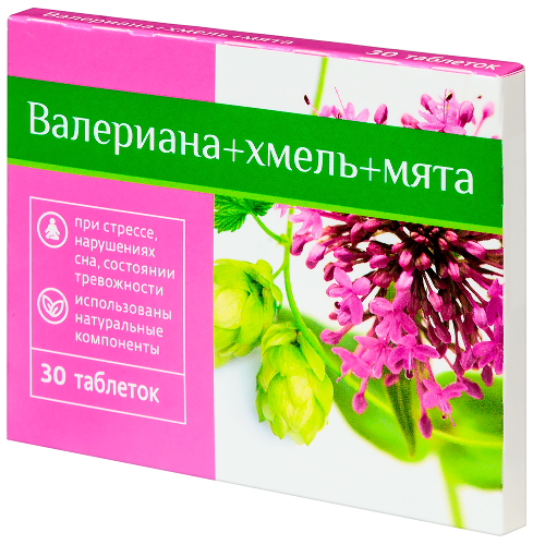 Валериана+хмель+мята таблетки - натуральное успокаивающее средство, применяется при нарушениях сна, состоянии тревожности.