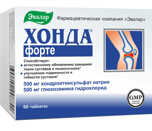 ХОНДА ФОРТЕ - Биологически активная добавка (БАД) к пище - Оптимальные дозировки хондроитина и глюкозамина - по 500 мг - для естественного обновления хрящевой ткани суставов и позвоночника, улучшения подвижности и гибкости суставов.