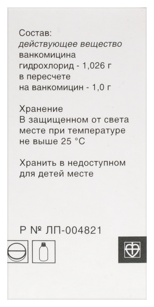 1 фл. Ванкомицин (в форме гидрохлорида) 1 г 1 фл. ванкомицин (в форме гидрохлорида) 1 г Вспомогательные вещества: хлористоводородная кислота или натрия гидроксид (до pH 3.2-3.3), азот, вода д/и 1 фл. ванкомицин (в форме гидрохлорида) 500 мг Вспомогательные вещества: хлористоводородная кислота или натрия гидроксид (до pH 3.2-3.3), азот, вода д/и Ванкомицина гидрохлорид 1,0 ванкомицина гидрохлорид в пересчете на ванкомицин - 0,5 г,