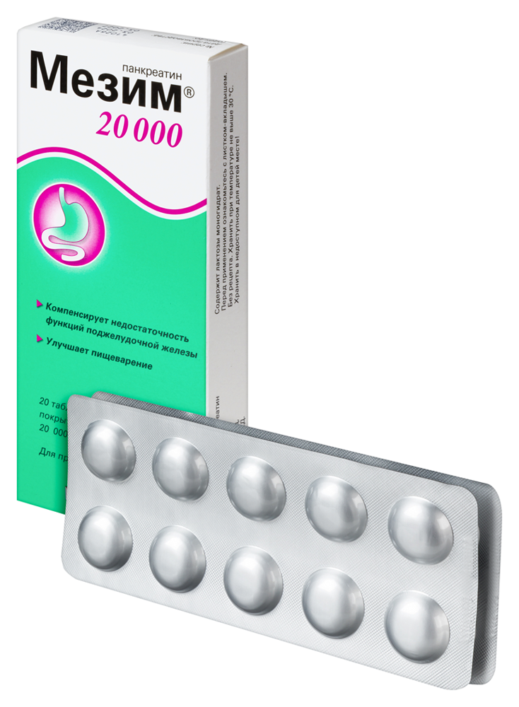 При приеме препаратов, содержащих панкреатин, возможно уменьшение всасывания фолиевой кислоты. Действие гипогликемических средств для перорального применения (акарбозы, миглитола) может уменьшаться при одновременном применении с препаратом Мезим® 20000. При одновременном применении препарата Мезим® 20000 с препаратами железа возможно снижение всасывания последних. Одновременное применение антацидных средств, содержащих кальция карбонат и/или магния гидроксид, может привести к снижению эффективности препарата.