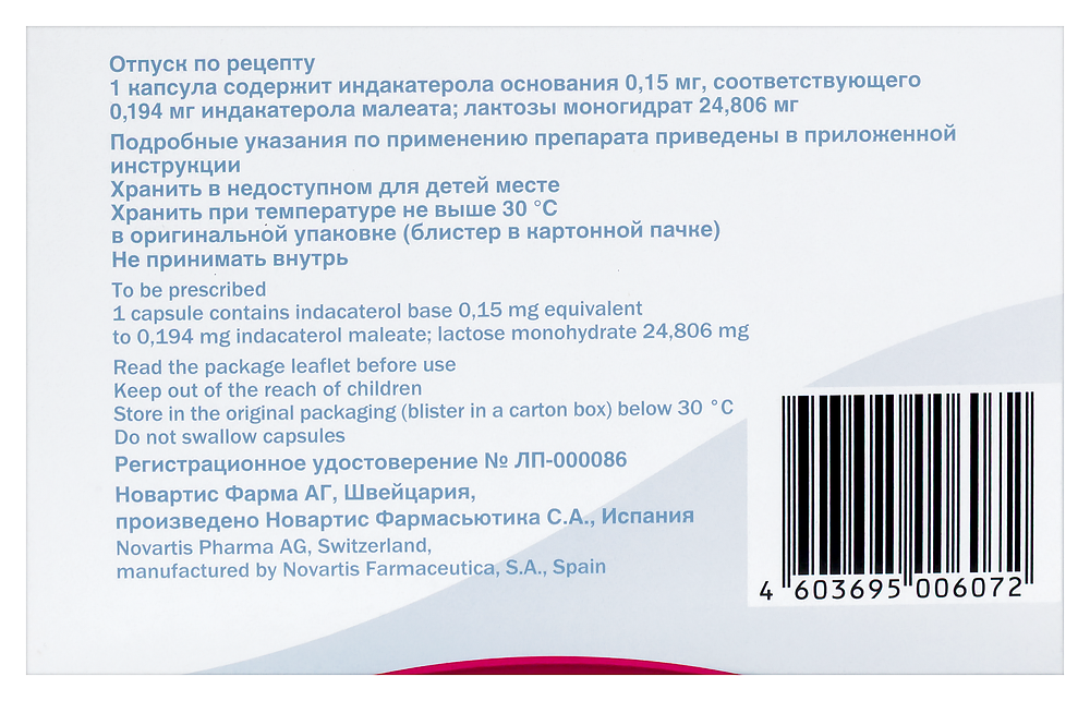 1 капс. индакатерола малеат 194 мкг, что соответствует содержанию индакатерола 150 мкг Вспомогательные вещества: лактозы моногидрат - 24.806 мг. Состав оболочки капсулы: желатин - 49 мг, чернила черные (шеллак (E904), краситель железа оксид черный (E172), вода очищенная, пропиленгликоль (E1520)).
