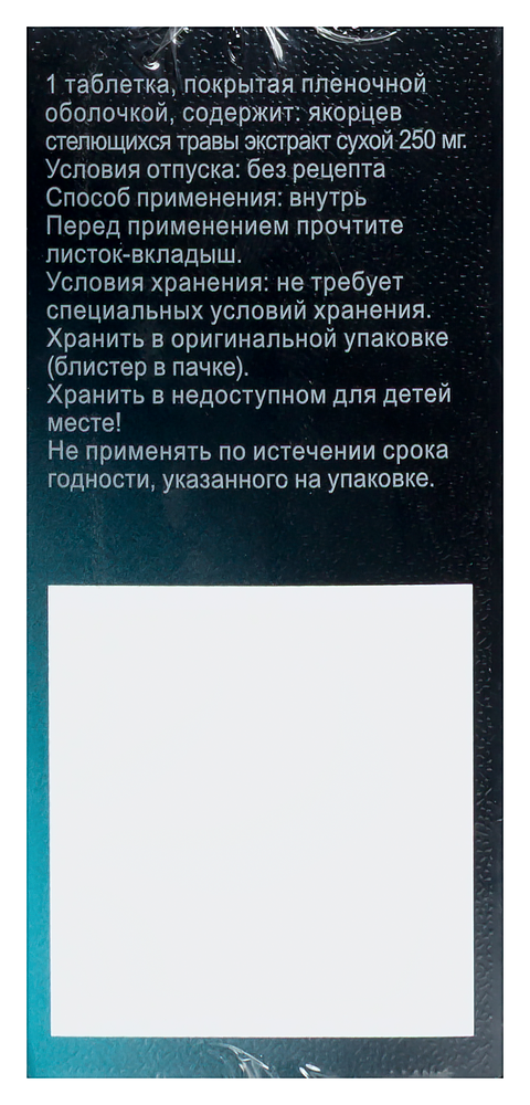Активное вещество: якорцев стелющихся травы экстракт сухой 250,0 мг (соотношение сырья и экстракта (35 - 45) : 1 + экстрагент - 70 % этанол) (содержание суммы фуростаноловых сапонинов в пересчете на протодиосцин не менее 112,5 мг).
