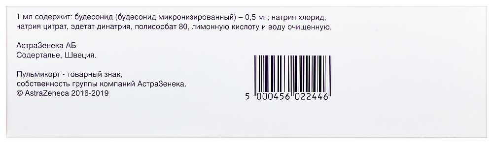 В 1 мл суспензии содержится: Активный ингредиент: будесонид (будесонид микронизированный) 0,25 мг Вспомогательные ингредиенты: натрия хлорид 8,5 мг, натрия цитрат 0,5 мг, эдетат динатрия (натриевая соль этилендиаминтетрауксусной кислоты (двухзамещенная) (динатриевая соль ЭДТА)) 0,1 мг, полисорбат 80 0,2 мг, лимонная кислота (безводная) 0,28 мг, вода очищенная до 1 мл.