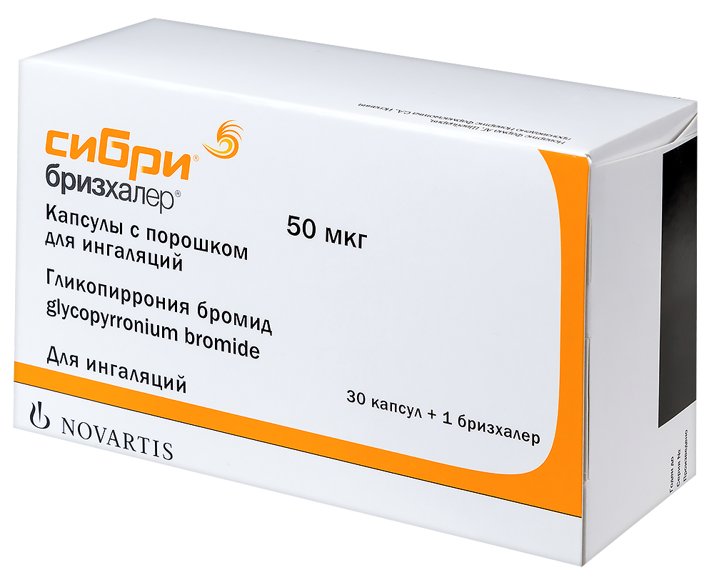 Сибри Бризхалер не рекомендован для купирования острых эпизодов бронхоспазма. Парадоксальный бронхоспазм Как и в случаях другой ингаляционной терапии, применение препарата Сибри Бризхалер может приводить к парадоксальному бронхоспазму, что может представлять угрозу для жизни. В случае возникновения парадоксального бронхоспазма, применение препарата Сибри Бризхалер должно быть немедленно прекращено и назначена альтернативная терапия. М-холиноблокирующий эффект Как и другие м-холиноблокирующие лекарственные средства препарат Сибри Бризхалер должен с осторожностью применяться у пациентов с закрытоугольной глаукомой или задержкой мочи. Пациенты должны быть проинформированы о признаках и симптомах острого приступа закрытоугольной глаукомы и о необходимости прекратить применение препарата Сибри Бризхалер, а также незамедлительно сообщать своему врачу, в случае развития любого из этих признаков или симптомов. Тяжелая почечная недостаточность Пациенты с тяжелой почечной недостаточностью (СКФ менее 30 мл/мин/1.73 м2), включая пациентов с терминальной стадией заболевания, нуждающихся в гемодиализе, должны тщательно наблюдаться на предмет развития возможных нежелательных лекарственных реакций. Препарат Сибри Бризхалер предназначен для поддерживающего лечения больных ХОБЛ. В связи с тем обстоятельством, что в общей популяции ХОБЛ существенно преобладают больные в возрасте старше 40 лет, при назначении препарата пациентам до 40 лет требуется спирометрическое подтверждение диагноза ХОБЛ. Влияние на способность выполнения потенциально опасных видов деятельности, требующих особого внимания и быстрых реакций (управление транспортными средствами, работа с движущимися механизмами и т.п.) Сибри Бризхалер не оказывает отрицательного влияния па способность управлять транспортными средствами и выполнение потенциально опасных видов деятельности, требующих повышенной концентрации внимания и быстроты психомоторных реакций. Передозировка Нет данных по передозировке препаратом Сибри Бризхалер. У пациентов с ХОБЛ регулярное ингаляционное введение препарата Сибри Бризхалер в общей дозе 100 и 200 мкг 1 раз в день в течение 28 дней хорошо переносилось. Острая интоксикация при случайном проглатывании капсулы препарата Сибри Бризхалер маловероятна вследствие низкой биодоступности гликопиррония бромида при пероральном применении (около 5%). Максимальная концентрация в плазме крови и общая системная экспозиция после внутривенного введения 150 мкг гликопиррония бромида (эквивалентно 120 мкг гликопиррония) у здоровых добровольцев были приблизительно в 50 и в 6 раз выше соответственно, чем максимальная концентрация в плазме крови и общая системная экспозиция в равновесном состоянии, достигаемые при применении препарата Сибри Бризхалер ингаляционно в рекомендуемых дозах (50 мкг 1 раз в день). Признаков передозировки при этом не выявлялось.