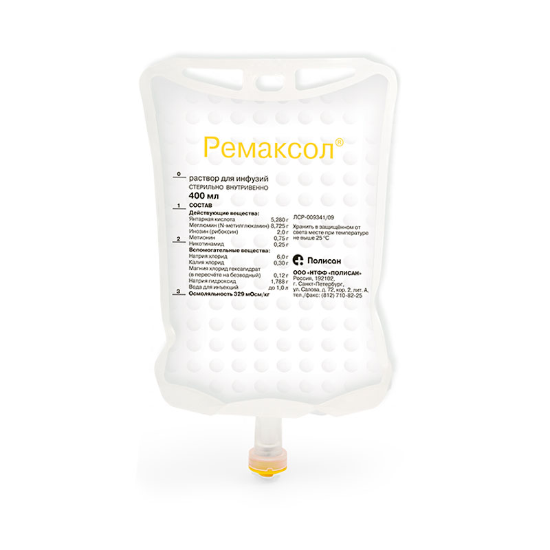 Действующие вещества: янтарная кислота - 5,280 г; меглюмин (N-метилглюкамин) - 8,725 г; инозин (рибоксин) - 2,0 г; метионин - 0,75 г; никотинамид - 0,25 г.