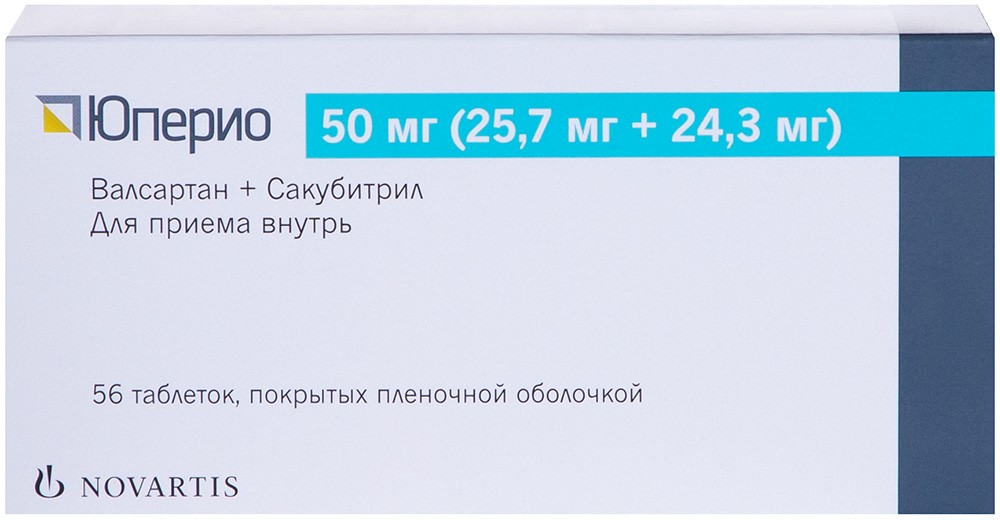 Всасывание После приема внутрь комплекс сакубитрила и валсартана распадается на сакубитрил, который затем метаболизируется с образованием метаболита - сакубитрилата, и валсартан; концентрации названных веществ в плазме крови достигают максимума через 0,5 ч, 2 ч и 1,5 ч соответственно. Абсолютная биодоступность сакубитрила и валсартана после приема внутрь составляет ?60% и 23% соответственно. Валсартан в составе препарата Юперио обладает большей биодоступностью по сравнению с другими таблетированными формами. В случае приема комплекса сакубитрила и валсартана дважды в сутки равновесные концентрации сакубитрила, сакубитрилата и валсартана достигаются через 3 дня. Статистически значимого накопления сакубитрила и валсартана в равновесном состоянии не отмечается; в то же время накопление сакубитрилата превышает концентрацию при однократном применении в 1,6 раза. Прием комплекса сакубитрила и валсартана одновременно с приемом пищи не оказывал клинически значимого влияния на показатели системного воздействия сакубитрила, сакубитрилата и валсартана. Снижение экспозиции валсартана в случае приема комплекса сакубитрила и валсартана одновременно с приемом пищи не сопровождается клинически значимым снижением терапевтического эффекта. Время приема комплекса сакубитрила и валсартана не зависит от времени приема пищи. Распределение Комплекс сакубитрила и валсартана в значительной степени связан с белками плазмы крови (94% - 97%). Сравнение экспозиций в плазме крови и СМЖ показывает, что сакубитрилат в небольшой степени проникает через гематоэнцефалический барьер (0,28%). Кажущийся объем распределения комплекса составляет от 75 до 103 л. Метаболизм Сакубитрил под действием ферментов быстро превращается в сакубитрилат, который далее существенно не метаболизируется. Валсартан метаболизируется в незначительной степени, в виде метаболитов обнаруживается лишь около 20% от введенной дозы. В плазме крови в незначительных концентрациях (<10%) обнаруживался гидроксильный метаболит. Поскольку и сакубитрил, и валсартан в минимальной степени метаболизируются при участии изоферментов цитохрома CYP450, изменение их фармакокинетики в случае одновременного применения препаратов, влияющих на изоферменты CYP450, представляется маловероятным. Выведение После приема внутрь 52-68% сакубитрила (главным образом, в виде сакубитрилата) и ~13% валсартана и его метаболитов выводятся почками; 37-48% сакубитрила (главным образом в виде сакубитрилата) и 86% валсартана и его метаболитов выводятся через кишечник. Сакубитрил, сакубитрилат и валсартан выводятся из плазмы крови со средними периодами полувыведения (T1/2), составляющими приблизительно 1,43 ч, 11,48 ч и 9,90 ч соответственно. Линейность / нелинейность В изученном диапазоне доз комплекса сакубитрила и валсартана (50-400 мг) фармакокинетические параметры сакубитрила, сакубитрилата и валсартана изменяются пропорционально дозе. Фармакокинетика в особых клинических случаях Пациенты старше 65 лет Экспозиции сакубитрилата и валсартана у пациентов данной категории выше на 42% и 30% соответственно, чем у пациентов более молодого возраста. Подобные различия не связаны с клинически значимыми эффектами, поэтому коррекции дозы препарата не требуется. Пациенты моложе 18 лет Применение препарата у пациентов данной категории не и