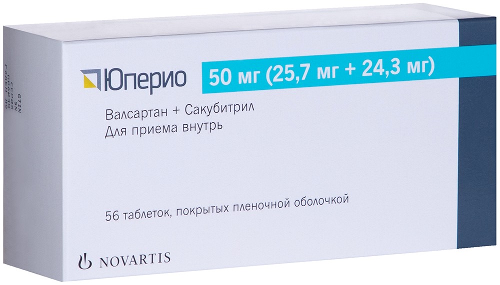 Всасывание После приема внутрь комплекс сакубитрила и валсартана распадается на сакубитрил, который затем метаболизируется с образованием метаболита - сакубитрилата, и валсартан; концентрации названных веществ в плазме крови достигают максимума через 0,5 ч, 2 ч и 1,5 ч соответственно. Абсолютная биодоступность сакубитрила и валсартана после приема внутрь составляет ?60% и 23% соответственно. Валсартан в составе препарата Юперио обладает большей биодоступностью по сравнению с другими таблетированными формами. В случае приема комплекса сакубитрила и валсартана дважды в сутки равновесные концентрации сакубитрила, сакубитрилата и валсартана достигаются через 3 дня. Статистически значимого накопления сакубитрила и валсартана в равновесном состоянии не отмечается; в то же время накопление сакубитрилата превышает концентрацию при однократном применении в 1,6 раза. Прием комплекса сакубитрила и валсартана одновременно с приемом пищи не оказывал клинически значимого влияния на показатели системного воздействия сакубитрила, сакубитрилата и валсартана. Снижение экспозиции валсартана в случае приема комплекса сакубитрила и валсартана одновременно с приемом пищи не сопровождается клинически значимым снижением терапевтического эффекта. Время приема комплекса сакубитрила и валсартана не зависит от времени приема пищи. Распределение Комплекс сакубитрила и валсартана в значительной степени связан с белками плазмы крови (94% - 97%). Сравнение экспозиций в плазме крови и СМЖ показывает, что сакубитрилат в небольшой степени проникает через гематоэнцефалический барьер (0,28%). Кажущийся объем распределения комплекса составляет от 75 до 103 л. Метаболизм Сакубитрил под действием ферментов быстро превращается в сакубитрилат, который далее существенно не метаболизируется. Валсартан метаболизируется в незначительной степени, в виде метаболитов обнаруживается лишь около 20% от введенной дозы. В плазме крови в незначительных концентрациях (<10%) обнаруживался гидроксильный метаболит. Поскольку и сакубитрил, и валсартан в минимальной степени метаболизируются при участии изоферментов цитохрома CYP450, изменение их фармакокинетики в случае одновременного применения препаратов, влияющих на изоферменты CYP450, представляется маловероятным. Выведение После приема внутрь 52-68% сакубитрила (главным образом, в виде сакубитрилата) и ~13% валсартана и его метаболитов выводятся почками; 37-48% сакубитрила (главным образом в виде сакубитрилата) и 86% валсартана и его метаболитов выводятся через кишечник. Сакубитрил, сакубитрилат и валсартан выводятся из плазмы крови со средними периодами полувыведения (T1/2), составляющими приблизительно 1,43 ч, 11,48 ч и 9,90 ч соответственно. Линейность / нелинейность В изученном диапазоне доз комплекса сакубитрила и валсартана (50-400 мг) фармакокинетические параметры сакубитрила, сакубитрилата и валсартана изменяются пропорционально дозе. Фармакокинетика в особых клинических случаях Пациенты старше 65 лет Экспозиции сакубитрилата и валсартана у пациентов данной категории выше на 42% и 30% соответственно, чем у пациентов более молодого возраста. Подобные различия не связаны с клинически значимыми эффектами, поэтому коррекции дозы препарата не требуется. Пациенты моложе 18 лет Применение препарата у пациентов данной категории не и