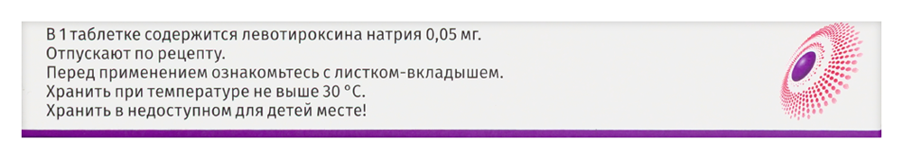 Левотироксин натрий 50 мкг Вспомогательные вещества: кальция гидрофосфат двуводный, целлюлоза микрокристаллическая, карбоксиметилкрахмала натриевая соль (тип А), декстрин, глицериды длинноцепочные парциальные.